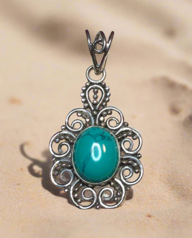 This stunning Sterling Silver Turquoise Pendant captures the essence of nature’s beauty in a timeless piece of jewelry. The vibrant turquoise stone, known for its captivating blue-green hue and unique patterns, is expertly set in high-quality sterling silver, creating a harmonious blend of color and shine. Each pendant showcases the natural variations of the turquoise stone, making every piece one-of-a-kind.