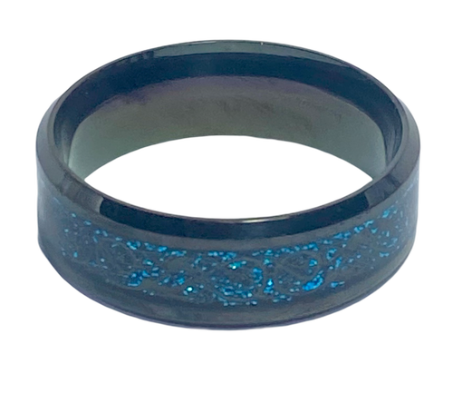 Stainless Steel - Black with blue pattern ring. Sizes 5, 6, 7, 8, 9, 10, 11, 12, 13 RW247