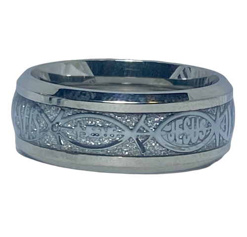 Stainless Steel - Silver with Jesus pattern ring. Size 8. RW243
