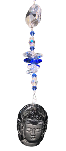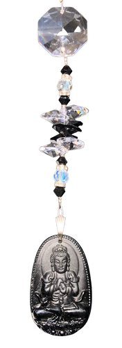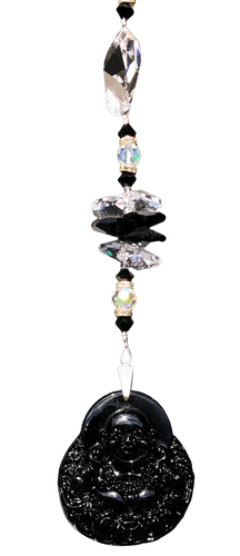 Black Obsidian Buddha suncatcher is decorated with crystals and Smokey quartz gemstones.