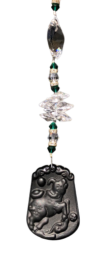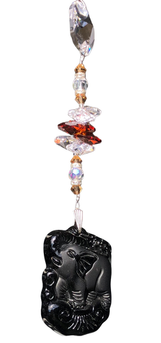Black Obsidian elephant suncatcher is decorated with crystals and tigers eye gemstones.