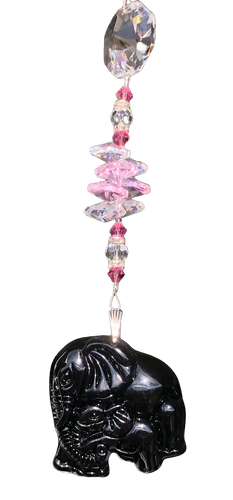 Black Obsidian elephant and baby suncatcher is decorated with crystals and Rose quartz gemstones.