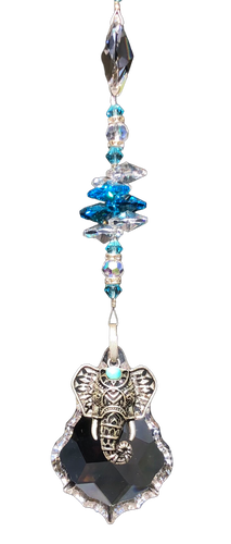 Elephant starburst crystal suncatcher is decorated with aquamarine gemstones.