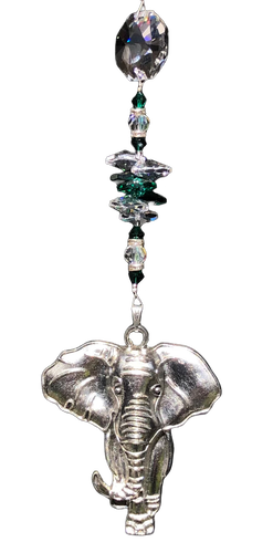 Elephant suncatcher is decorated with crystals and malachite gemstones.