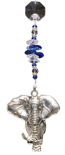 Elephant suncatcher is decorated with crystals and lapis lazuli gemstones.