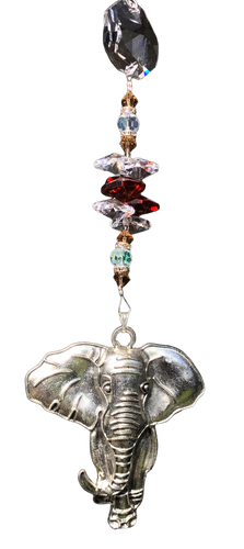Elephant suncatcher is decorated with crystals and carnelian gemstones.