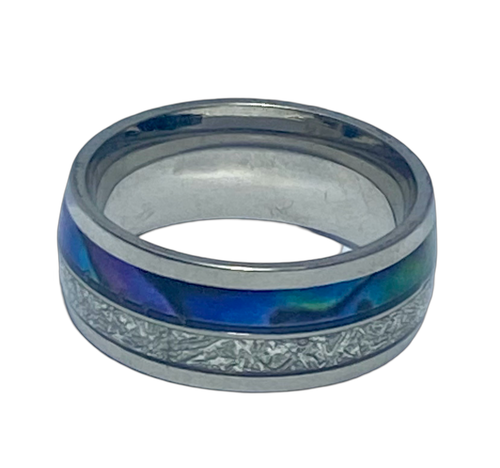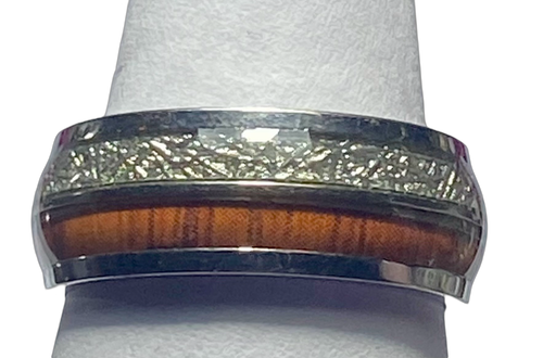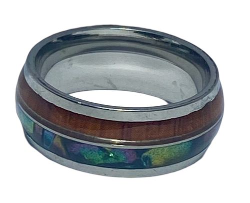 Stainless Steel - Silver ring with wood & shell pattern. Sizes 5, 6, 7, 8, 9, 10, 11, 12, 13, 14 RW222