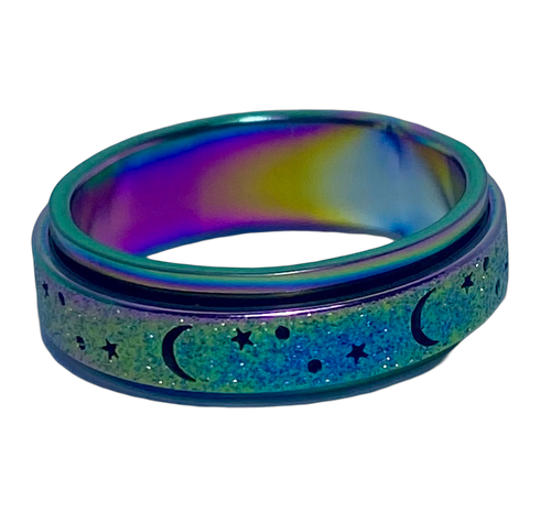 Fidget ring - Rainbow glitter moons & stars spinner. Sizes 6, 10, 11, 13. FR124