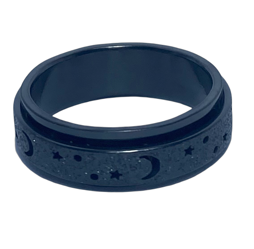 Fidget ring - Black glitter moons & stars spinner. Sizes 5, 6, 8, 9, 10, 11, 12. FR123