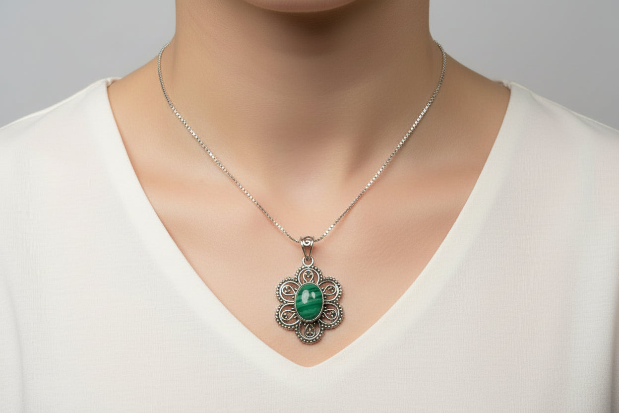 Malachite sterling silver pendant PN79Measures approx. 40mm x 24mm Chain not included