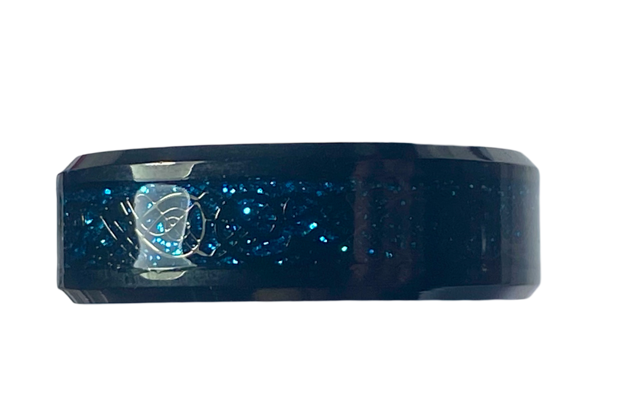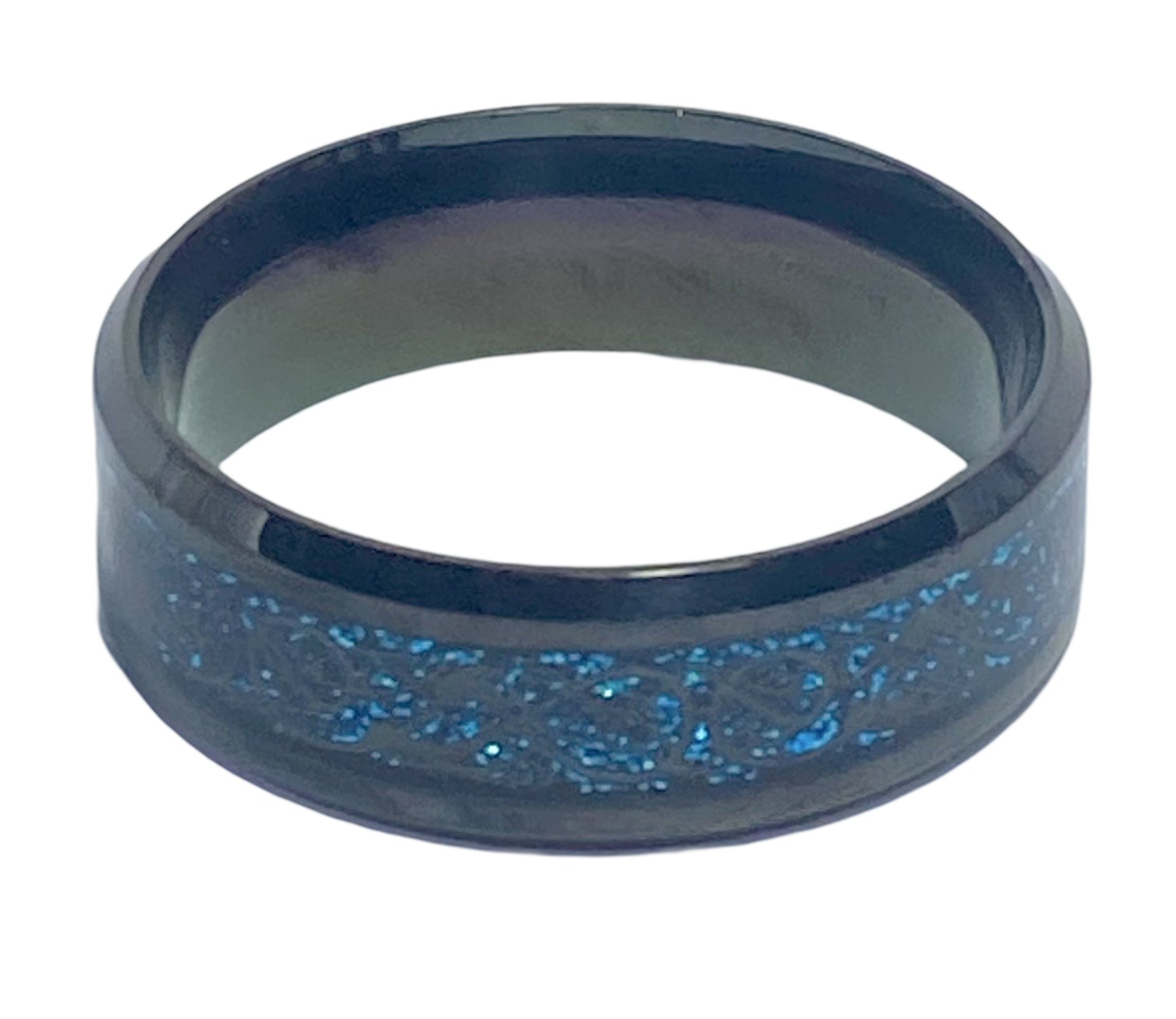 Stainless Steel - Black with blue pattern ring. Size 14. RW248