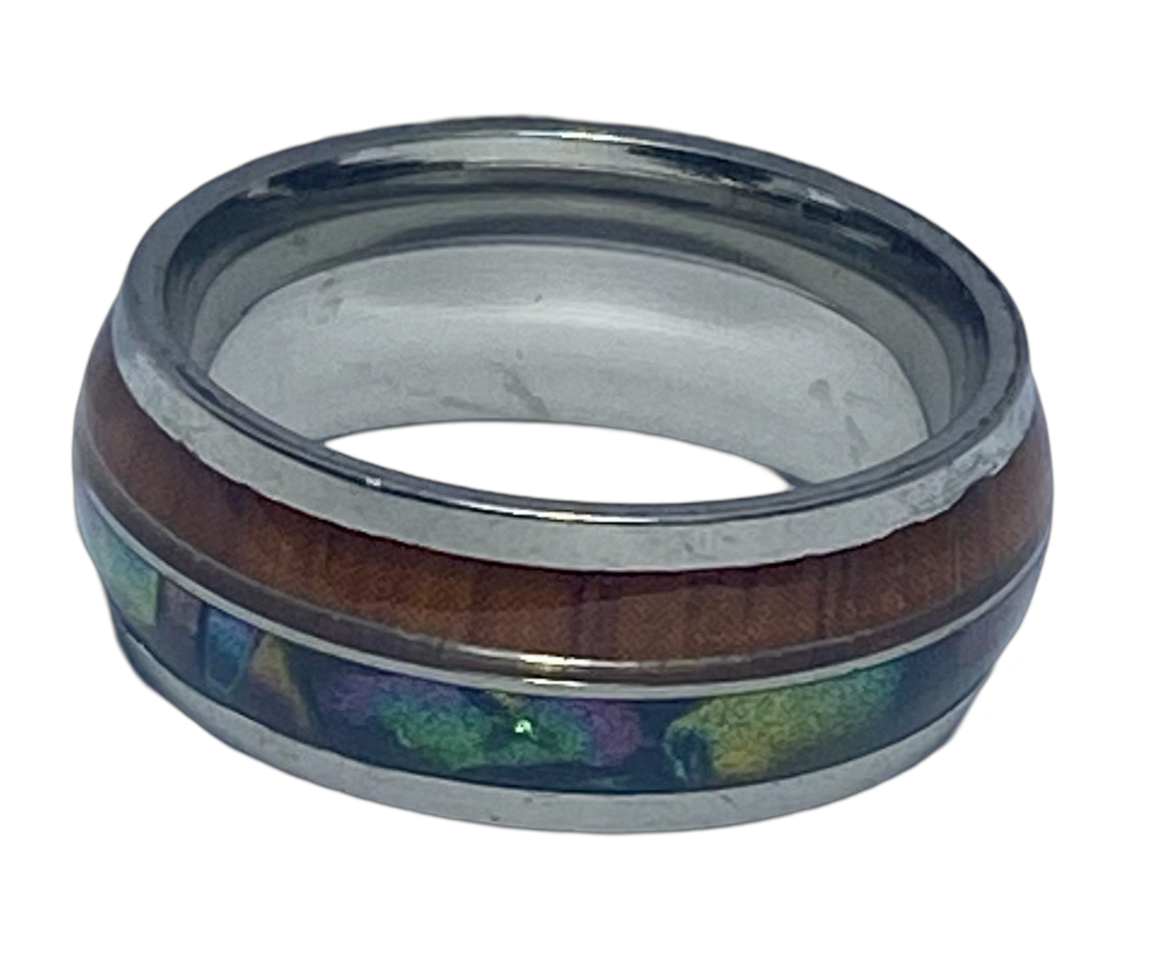 Stainless Steel - Silver ring with wood & shell pattern. RW222
