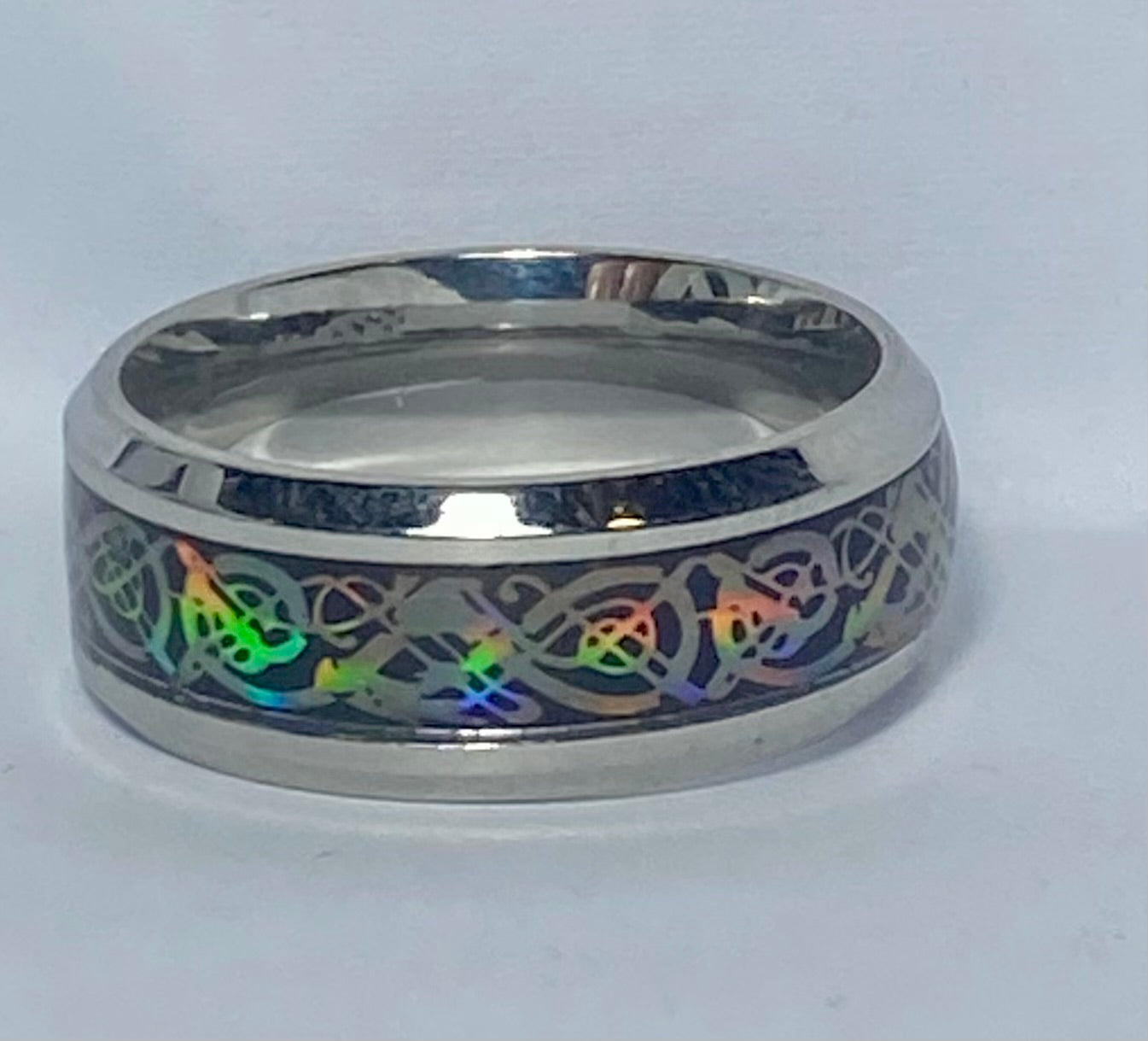Stainless Steel - Silver with black & iridescence ring. Sizes 5, 6, 7, 8, 9,10, 11, 12, 13, 14. RW237