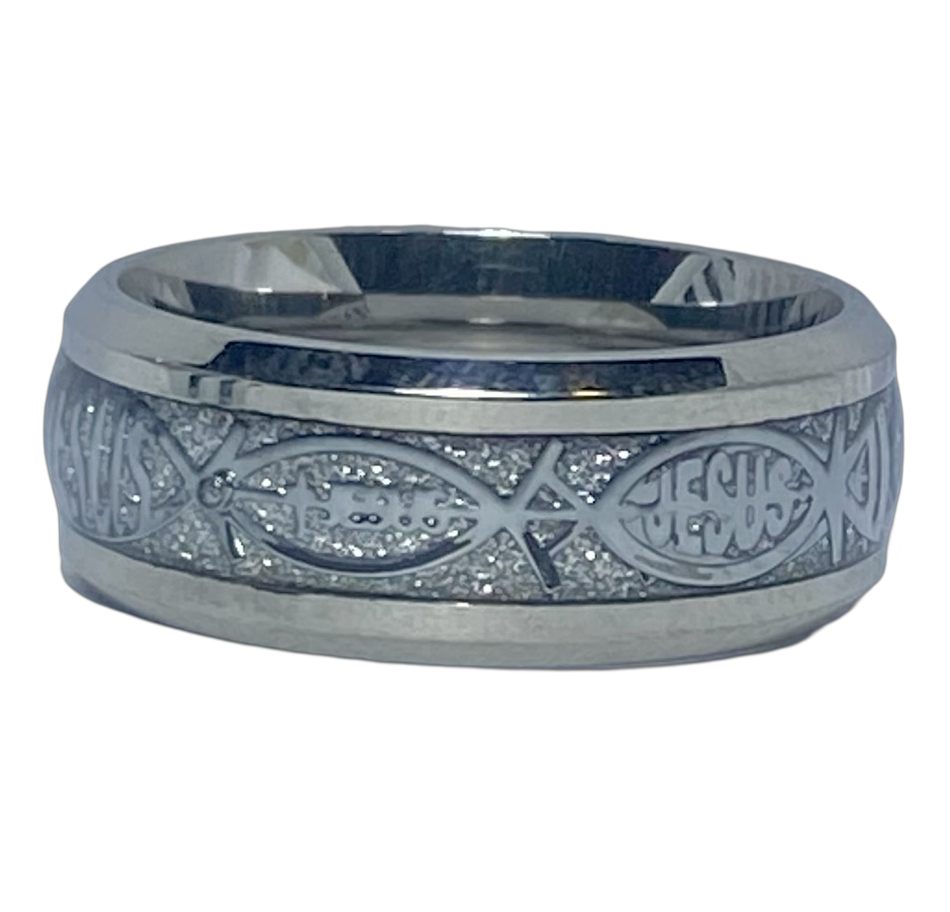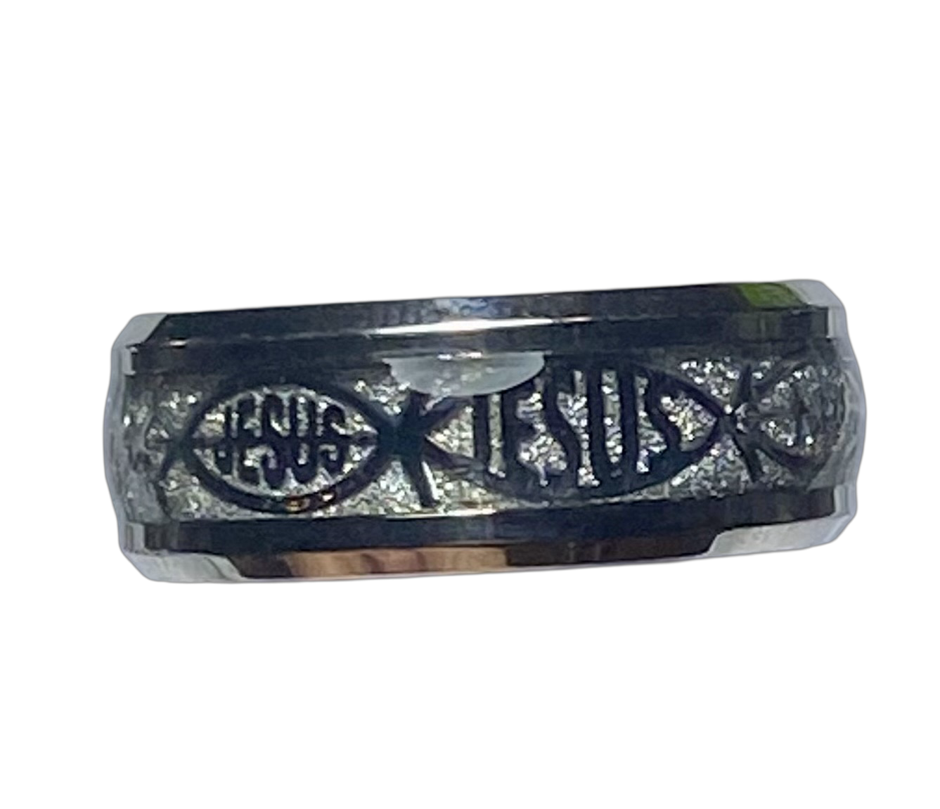Stainless Steel - Silver with Jesus pattern ring. Size 8. RW243
